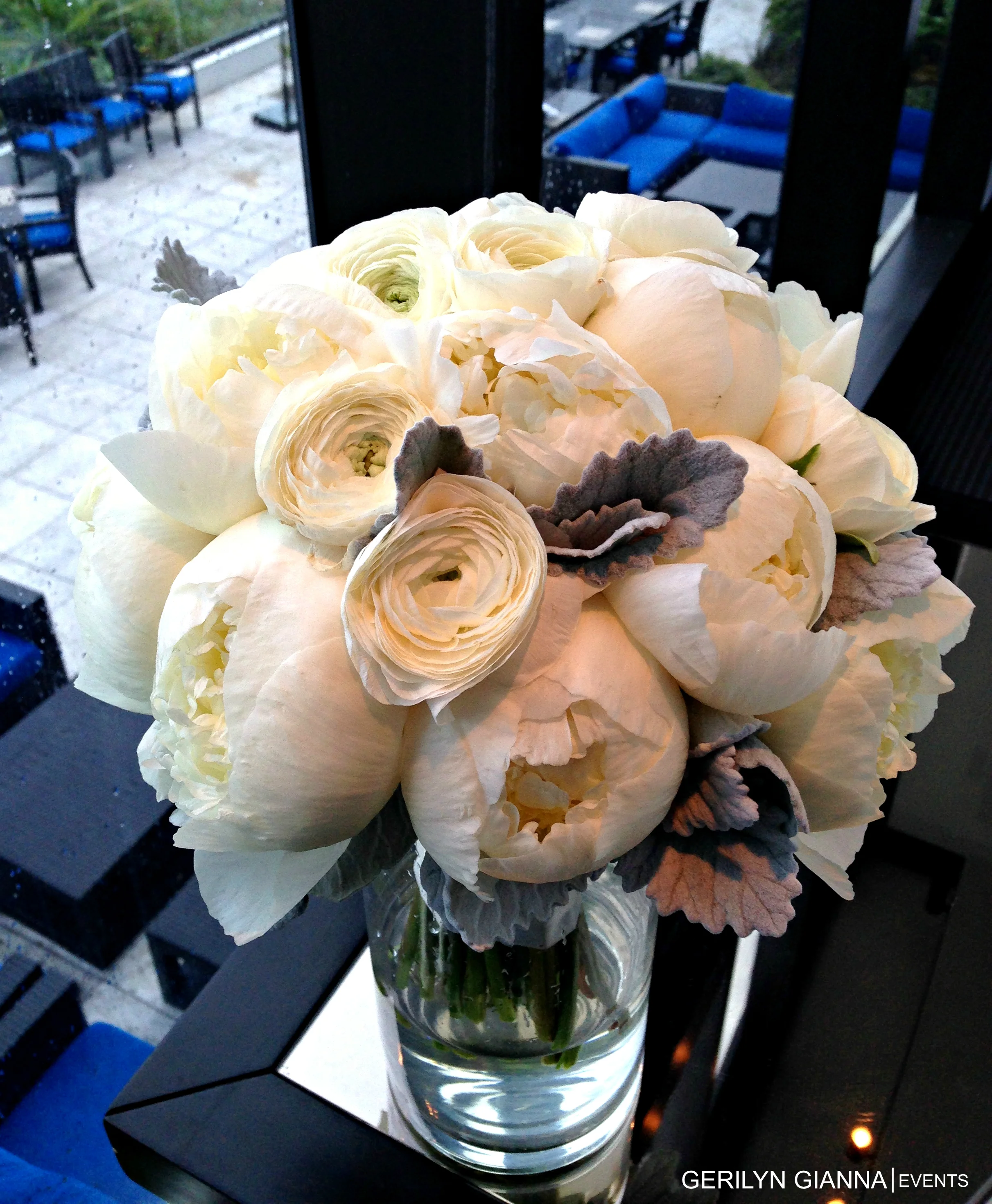 Our focus in this design was to bring a little shimmer and shine with a glitzy linen, silver vases and silver mercury candles. White was the main color that contrasted the silver nicely. White peonies, white hydrangeas, and a gray dusty miller rounded out the floral design. For a second centerpiece, we used a natural color light manzanita tree with hanging crystals and hanging candles.